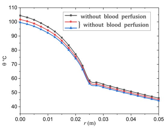 As shown in Figure 2, the influence of the metabolic heat generation rate on the MGT non-Fourier bioheat transfer model is investigated in a wide range of skin distances m. The transient temperature increases in the tumor and normal tissues are shown in Figure 2 with and without the influence of the metabolic heat production rates and blood perfusion. In such situations, the perfusion rates and caused the temperature to decrease. In other words, blood perfusion rates serve as cooling mechanisms, as observed in [77]. As the temperature differential between tissue and blood grows, heat loss due to blood perfusion rises, slowing the rate of temperature rise , as illustrated in Figure 2. It is probable that the heat transfer rate in the tissues reaches a stable state as a result of the cooling impact of the blood perfusion.