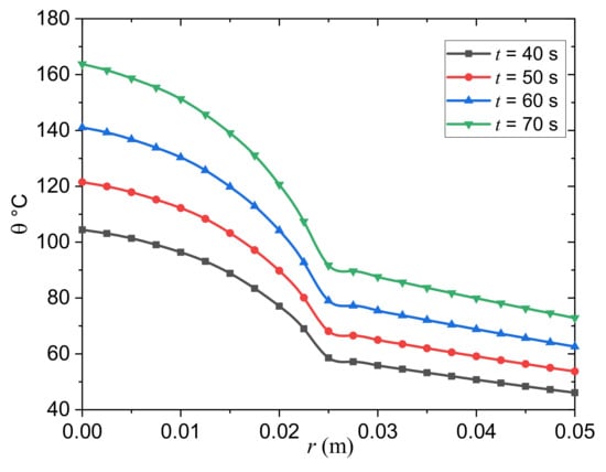 As previously stated, the Moore–Gibson–Thompson Pennes bioheat transfer (MGTPBT) model assumes the energy equation for the blood subdomain in this study. The temperature distribution, , versus the distance, , is examined in the last case, and several models of the PBT equation are evaluated at time . The temperature variation is displayed in Figure 4.