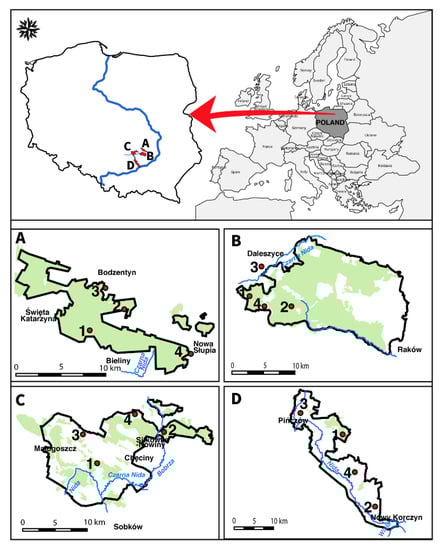 During the years 2017–2020, we conducted a survey of the bumblebee species at 16 sites in the Małopolska Upland (southern Poland) previously sampled between 2003–2006. In each of the 16 sites, we established a permanent bee walk transect of 100 m to 100 m (squares of the UTM grid) to count foraging bumblebees (a modified version of Goulson et al. []). The field trips covered the entire flowering season (from the beginning of May to the beginning of September), and we collected bumblebees with an aerial net on flowers or while in flight. GPS locations were recorded using handheld GPS units or cell phones (Garmin Ltd., Apple Inc., Modesto, CA, USA) and later verified using Google Earth Pro (version 7.3.2. Google LLC, CA, Mountain View, USA). The collecting sites are shown on the map of the Małopolska Upland (Figure 1). These sites were located in four parks: Świętokrzyski National Park (SNP), Cisowsko-Orłowiński Landscape Park (COLP), Chęcińsko-Kielecki Landscape Park (ChKLP), and Nadnidziański Landscape Park (NLP). Based on phytosociological and ecological analysis of forest and non-forest communities occurring in southern Poland, we distinguished: (a) association Querco roboris-Pinetum, class Vaccinio-Piceetea, with dominant species Pinus sylvestris (pine), Quercus robur (common oak), Betula pendula (silver birch), Frangula alnus (alder buckthorn) and Corylus avellana (common hazel); (b) association Fraxino-Alnetum, class Querco-Fagetea with dominant species Alnus glutinosa (common alder), Filipendula ulmaria (meadowsweet), Equisetum sylvaticum (wood horsetail), Asarum europaeum (asarabacca), Lysimachia vulgaris (yellow loosestrife), and Valeriana officinalis (garden valerian);