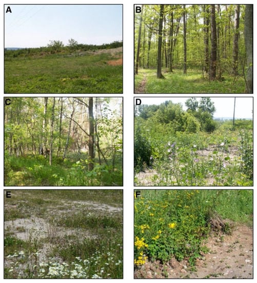 The representative natural and semi-natural habitats in the Małopolska Upland (southern Poland) where bumblebee collections were carried out between 2003–2006 and 2017–2020: (A) ruderal plant communities from the class Stellarietea mediae (NLP); (B) boron-mixed Vaccinio-Piceetea (ŚNP); (C) riparian forest Querco-Fagetea (ŚNP); (D–F) class Artemisietea vulgaris with all ruderal and nitrophilous fringe communities dominated by biennials and perennials (COLP).