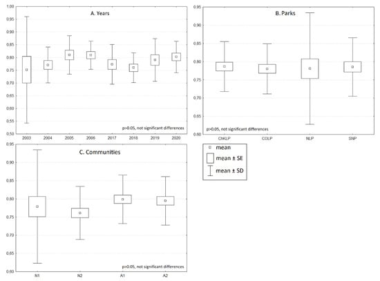 Simpson’s diversity index calculated for: (A) the years in which the studies was performed; (B) the research objects–parks; (C) the studied communities. The differences were not statistically significant in any case. Legend: N1, N2-natural habitats; A1, A2-semi-natural habitats. Sites: ChKLP–Chęcińsko-Kielecki Landscape Park; COLP–Cisowsko-Orłowiński Landscape Park; NLP–Nadnidziański Landscape Park; SNP–Świętokrzyski National Park.