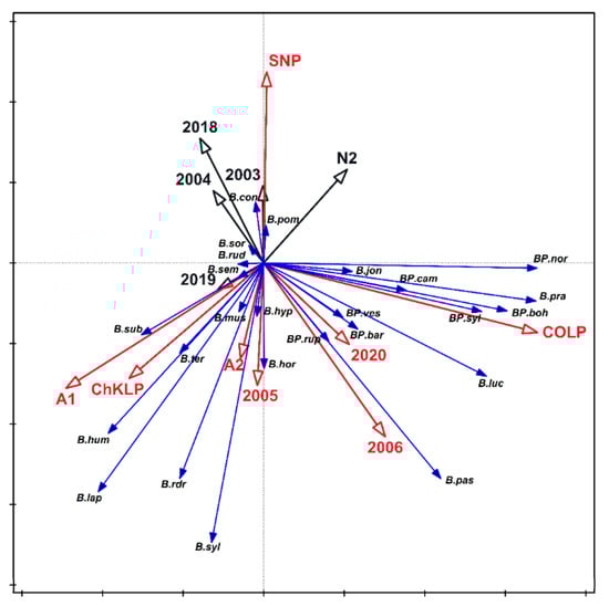 Habitat fragmentation and bumblebee community composition. Redundancy analysis showing the relationships between bumblebees (species), habitats (natural N1, N2 and semi-natural A1, A2), sites (ChKLP—Chęcińsko-Kielecki Landscape Park, COLP—Cisowsko-Orłowiński Landscape Park, NLP—Nadnidziański Landscape Park, SNP—Świętokrzyski National Park), and years of the study. The vectors of variables significantly differentiating the examined sets are marked in red. The variables account for 40.8% of the total variability. Species were abbreviated and labelled with blue, smaller, vectors. Abbreviations of species names in Figure 4 consist of one letter of a generic name and three letters of a species name. Legend: BP.bar Bombus (Ps.) barbutellus; BP.boh B. (Ps.) bohemicus; BP.cam B. (Ps.) campestris; BP.nor B. (Ps.) norvegicus; BP.rup B. (Ps.) rupestris; BP.syl B. (Ps.) sylvestris; BP.ves B. (Ps.) vestalis; B.con B. confusus; B.hor B. hortorum; B.hum B. humilis; B.hyp B. hypnorum; B.jon B. jonellus; B.lap B. lapidarius; B.luc B. lucorum; B.mus B. muscorum; B.pas B. pascuorum; B.pom B. pomorum; B.pra B. pratorum; B.rdr B. ruderarius; B.rud B. ruderatus; B.sem B. semenoviellus; B.sor B. soroeensis; B.sub B. subterraneus; B.slv B. sylvarum; B.ter B. terrestris.