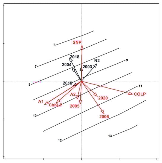 Average number of bumblebees in the ordination space. The vectors of variables significantly differentiating the examined set are marked in red. Isolines represent the gradient of the changing number of species in the tested samples. Legend: N1, N2—natural habitats; A1, A2—semi-natural habitats. Sites: ChKLP—Chęcińsko-Kielecki Landscape Park; COLP—Cisowsko-Orłowiński Landscape Park; NLP—Nadnidziański Landscape Park; SNP—Świętokrzyski National Park.