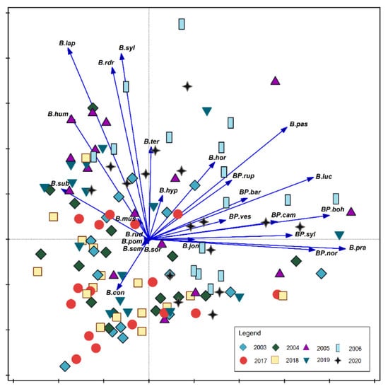 Principal Component Analysis (PCA) showing the relationships between bumblebees community and study years. The species are presented with vectors, and study years are marked with geometrical figures according to the legend in the Figure: blue rhombus—2003, green rhombus—2004, purple triangle—2005, light blue rectangle—2006, red circle—2017, green triangle, brown cross—2020. Abbreviations of species names consist of one letter of a generic name and three letters of a species name. All abbreviations as in Figure 4.