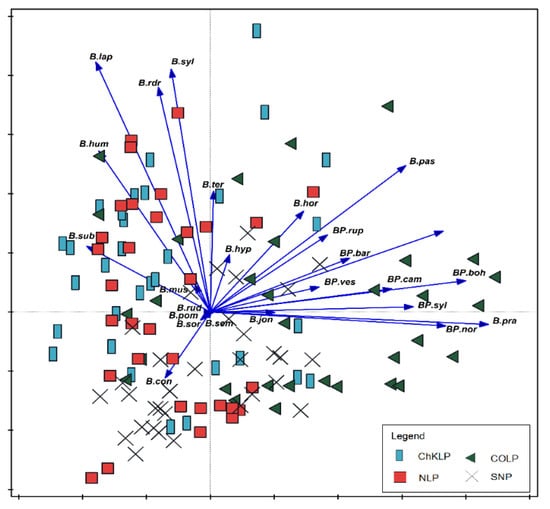 Principal Component Analysis (PCA) showing the relationships between bumblebees community and occurrence in parks. The species are presented with vectors and the parks are marked with geometrical figures: rectangle—ChKLP (Chęcińsko-Kielecki Landscape Park), triangle—COLP (Cisowsko-Orłowiński Landscape Park), square—NLP (Nadnidziański Landscape Park), cross—SNP (Świętokrzyski National Park). Abbreviations of species names consist of one letter of a generic name and three letters of a species name. All abbreviations as in Figure 4.