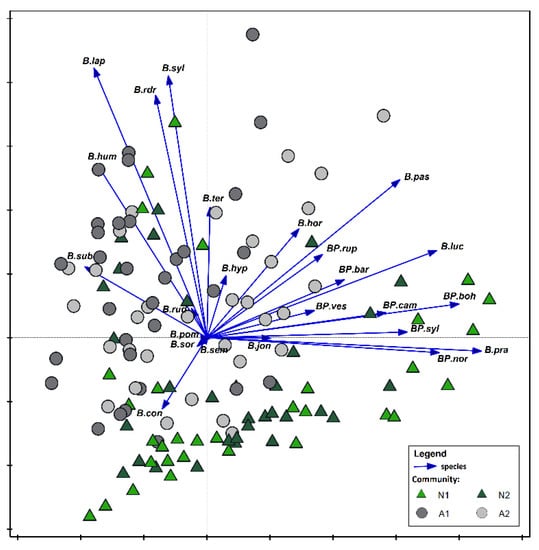 Principal Component Analysis (PCA) showing the relationships between bumblebees community and natural (A1) and semi-natural (A2) habitats. The species are presented with vectors, and the habitats are marked with geometrical figures: triangle—N1+N2 (natural habitats), circle—A1+A2 (semi-natural habitats). Abbreviations of species names consist of one letter of a generic name and three letters of a species name. All abbreviations as in Figure 4.