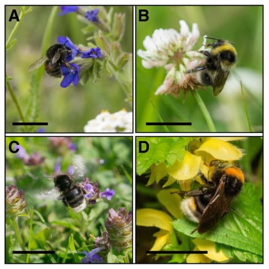 Examples of bumblebee species collected in southern Poland: (A) Bombus humilis, female visiting Anchusa officinalis; (B) Bombus jonellus, worker visiting Trifolium sp.; (C) Bombus soroeensis, worker visiting Prunella vulgaris; (D) Bombus vestalis from visiting Galeobdolon luteum. Scale bars = 0.5 cm.
