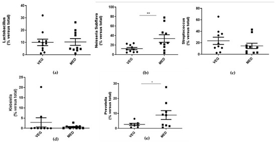 When the salivary microbiota was analyzed, the data showed that MED subjects presented significantly higher percentages of Subflava and Prevotella species compared to VEG ones. Several factors could influence differences in the oral microenvironment. Among them, different bacterial intakes and their substrate consumption, seem to affect microbiota composition [6]. In addition, plant-based nutrition provides a remarkable amount of medium-chain fatty acids, unsaturated fatty acids, and fibers that influence microbial species growth. In contrast to our study, the vegan diet has been shown to favor Subflava and Prevotella species [10] when compared to omnivorous diets. Actually, it should also be considered that the Mediterranean diet is rich in fruits and vegetables with a high content of fibers [26]. This feature may explain the abundance of Subflava and Prevotella found in our subjects, compared to VEG. Consistent with our results, a previous study had already demonstrated that the Mediterranean diet, with its high intake of short-chain fatty acids, favored the abundance of Prevotella in the gut microbiota [27].