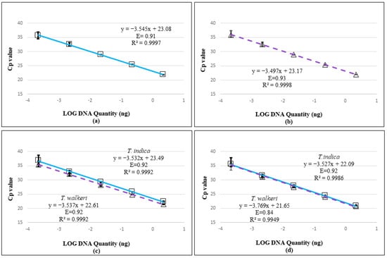 Standard curves showing the regression between DNA log quantities (ng, x-axis) and cycle thresholds (Cp, y-axis) for the four qPCR assays, generated with serial dilutions (~2.2 to ~2.2 × 10−4 ng/µL) of the target species, T. indica DAOMC 236416 (squares/solid line) and T. walkeri DAOMC 236422 (triangles/dotted line). (a) TinOG09272 specific to T. indica; (b) TwaOG10415 specific to T. walkeri; and complex-specific detecting both species, (c) OG08220 and (d) OG01193. Plotted are the average Cp values for the initial 3 replicates run for each dilution and error bars for all replicates (3 for the first three dilutions, 18 for the last 2).