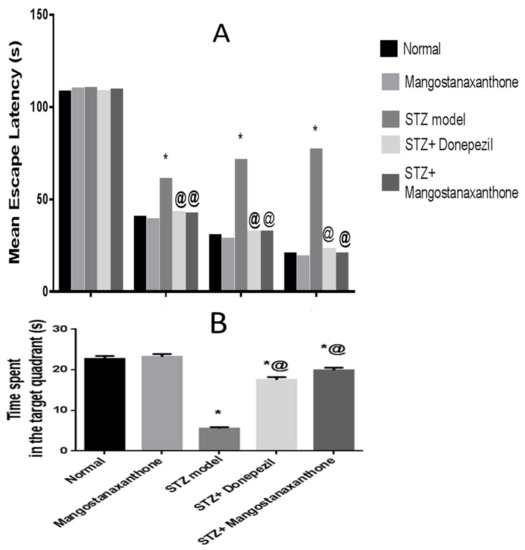 Induction of SAD was carried out as previously described by Rasheed et al. in 2018 [2]. Streptozotocin (STZ) and donepezil (Sigma–Aldrich, St. Louis, MO, USA) were dissolved in 0.9% saline [26,27]. Mice were randomly distributed into five groups each containing 10 mice. Group I received 0.9% saline ICV as well as distilled water with 5% carboxymethylcellulose oral and deemed as the normal group, while group II received MX-IV (30 mg/kg/day, oral) [28]. Group III was injected with STZ 3 mg/kg, ICV) once [2]. Groups IV and V received STZ (3 mg/kg, ICV) once, then after 5 h, group IV was injected with MX-IV (30 mg/kg/day, oral) while group V received donepezil (2.5 mg/kg/day, oral) [3]. Both MX-IV and donepezil were injected daily for 21 days. Morris water maze test was carried out one day following the end of the injection schedule.