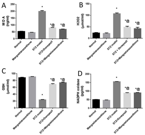 Effect of MX-IV on prominent oxidative stress owing to ICV-STZ injection. (A) MDA; (B) H2O2; (C) GSH; (D) NADPH oxidase. Values are expressed as mean ± SEM; n = 7. * p < 0.05 vs. normal group, @ p < 0.05 vs. ICV-STZ group.