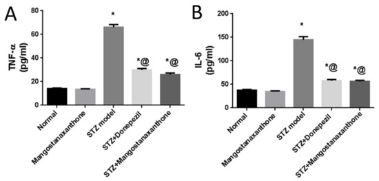 Effect of MX-IV on neuro-inflammation linked to ICV-STZ-injection. (A) TNF-α; (B) IL-6. Values are expressed as mean ± SEM; n = 7. * p < 0.05 vs. normal group, @ p < 0.05 vs. ICV-STZ group.