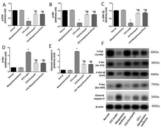 Effect of MX-IV on ICV-STZ-induced disruption in (A) p-PI3K; (B) p-Akt; (C) p-GSK-3β; (D) p-tau protein, and (E) cleaved caspase-3 expression (F) Western blot analysis of p-PI3K, p-Akt, p-GSK-3β, p-tau protein, and cleaved caspase-3 levels. Values are expressed as mean ± SEM; n = 7. * p < 0.05 vs. normal group, @ p < 0.05 vs. ICV-STZ group. Please refer to the full western blot in the Supplementary Materials.