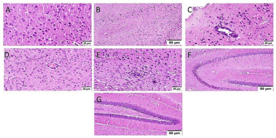 Histopathological alteration induced by ICV-STZ injection (n = 3) (H&E × 400). Mice injected with ICV-STZ (group III) showed (A) numerous scattered dark degenerated neurons of the cerebral cortex (B) and the striatum. The cerebral cortical blood vessels also exhibited (C) severe vasculitis associated with neuronal degeneration and neuronophagia (D) congestion with diffuse gliosis and (E) focal lymphocytic infiltration with degenerated neurons. The hippocampus showed numerous dark degenerated neurons of (F) cornu ammonis (CA) 3&4 as well as (G) dentate gyrus (DG) regions.