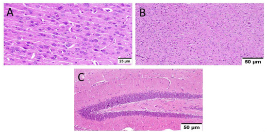 Histopathological examination of normal mice brain (n = 3) (H&E × 400). Normal mice (group I) showed normal histological structure of different neurons in the (A) cerebral cortex, (B) the hippocampus, and(C) the striatum.