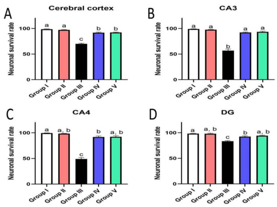 Effect of administration of MX-IV on neuronal survival rate (n = 3). Neuronal survival rate of different experimental groups was examined in (A) the cerebral cortex, (B) CA3, (C) CA4, and (D) DG regions. Values are expressed as mean ± SEM; n = 3. Different letters (a–c) above the error bar indicate statistically significant differences at p < 0.05.