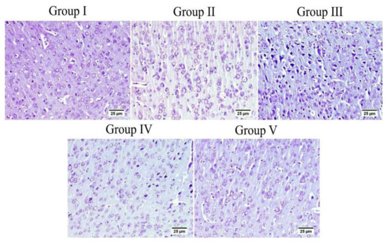 The cerebral cortex of different groups stained with Nissl stain. Normal group (group I) and mice injected with MX-IV (group II) showed normal healthy neurons. ICV-STZ group (group III) revealed numerous affected neurons. ICV-STZ-injected mice which received MX-IV (group IV) showed a fewer number of degenerated neurons. Donepezil-treated ICV-STZ-injected mice (group V) showed apparently normal cortex.