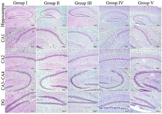 The hippocampus of different groups stained with Nissl stain. An elevated number of dark and shrunken neurons with pyknotic nuclei was detected in the ICV-STZ group (group III) especially in CA3, CA4, and DG regions; otherwise, the remaining experimental groups mostly exhibited normal intact neurons in all hippocampal regions.