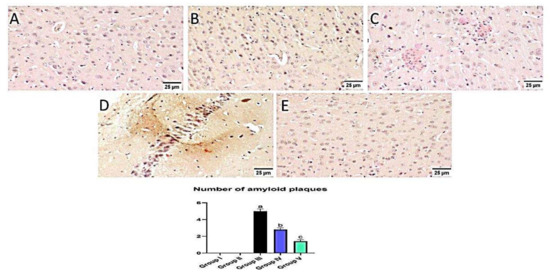 Normal animals showed no amyloid deposition in the brain tissue whether they received MX-IV or not (group II and I, respectively). However, large and multifocal areas of amyloid deposition associated with inflammatory tissue response were detected in group III which received ICV-STZ injection. Administration of MX-IV resulted in a noticeable decline in the number and size of amyloid plaques in the brain tissue. Group V, which was injected with donepezil, showed few to absence of amyloid plaques in most of the investigated sections (Figure 14).