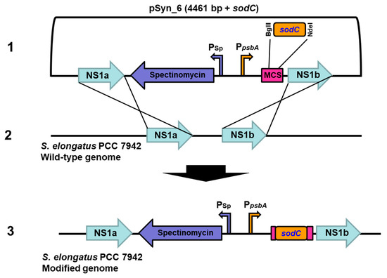 Vector and integration maps of the sodC gene in neutral sites of S. elongatus PCC 7942. Schematic showing pSyn_6 vector containing sodC flanked by the neutral sites (1) and its mode of homologous recombination with NS1a and NS1b of S. elongatus PCC 7942 (2), resulting in genetic integration of the sodC gene in S. elongatus PCC 7942 genome (3). Psp, spectinomycin promoter; PpsbA, constitutive promoter of psbA gene; MCS, multiple cloning site.