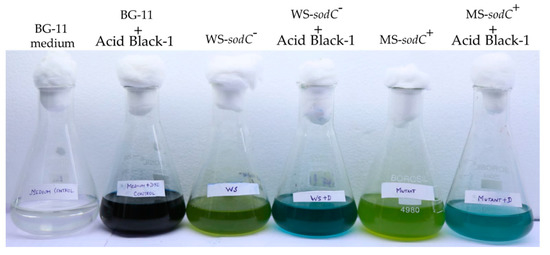Dye-treatment experimental set-up showing representative control flasks (BG-11 medium alone, and BG-11 medium with Acid Black-1 dye), control strains (WS-sodC− and MS-sodC+ in BG-11 medium), and strains (WS-sodC− and MS-sodC+) grown for 24 h in the BG-11 medium containing Acid Black-1 dye.