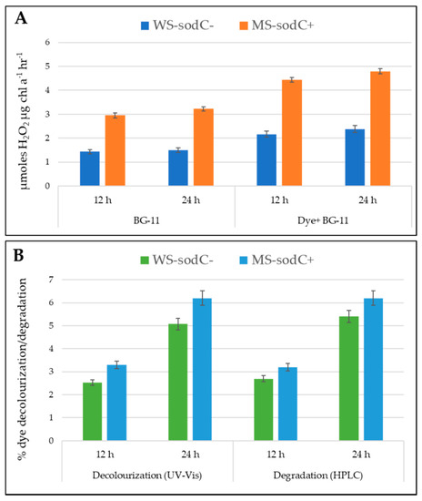 The figure depicts the H2O2 production (A), decolorization, and degradation (B) properties of WS-sodC− and MS-sodC+ S. elongatus PCC 7942 strains after the 12th and 24th hours of cultivation with azo dye, Acid black-1. The MS-sodC+ showed higher H2O2 production, decolorization, and degradation when compared with WS-sodC− strain.
