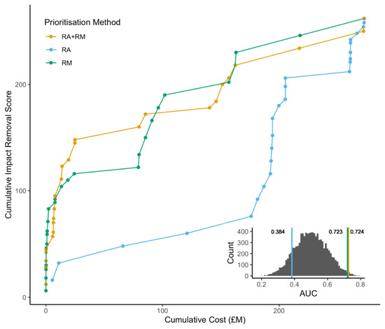 Cost–benefit curves of three prioritisation approaches based on risk assessment (RA, blue), risk management (RM, green) or a combination of both (RA + RM, yellow). Points denote the cumulative cost (GPB M) and impact reduction for the removal of species on each prioritised list in rank order. The area under the curve (AUC) for each approach was calculated, and significance was assessed by 10,000 permutations. The inset shows the frequency distribution of AUC from 10,000 randomised IAS lists compared to the prioritisation approaches. (Original data on risk assessment and risk management scores from previously published studies [20,30,36]).