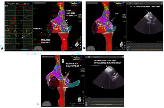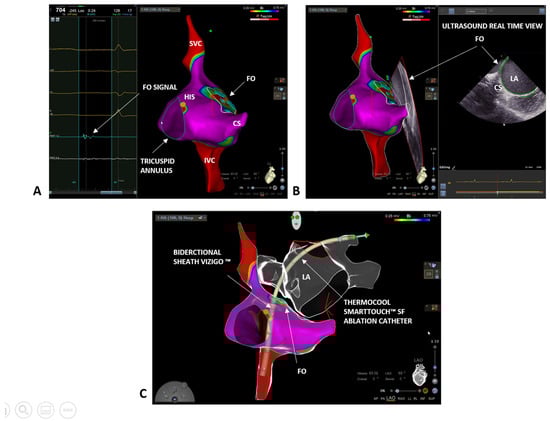 We started the procedure by performing a bipolar map of the right atrium with a ThermoCool SmartTouch™ SF (Biosense Webster, Johnson & Johnson Medical S.p.a., Irvine, CA, USA) ablation catheter. First, we delineated the inferior and superior vena cava, and the coronary sinus, and we tagged in yellow the His potential (Figure 1A). Next, we carefully reconstructed the interatrial septum and, finally, to precisely define the fossa ovalis (FO), we set the color range on the bipolar map to 0.25–0.75 mV and we tagged in light blue all the fragmented and low voltage signals, which are typical of the FO area [13] (Figure 1A). The FO location was further confirmed by the ICE and the CartoSound® module (Biosense Webster, Johnson & Johnson Medical S.p.a., Irvine, CA, USA). A 10F Soundstar™ Ultrasound catheter was advanced in the right atrium and pointed at the FO. Thanks to the CartoSound® module, it was possible to mark the contours of the FO location and to visualize them on the 3D EAM previously obtained (Figure 1B). In addition to the FO, using ICE and the CartoSound® module, it was possible to assess and to reconstruct the structures of the left atrium (left atrial appendage, pulmonary veins, and esophagus). Next, a single transseptal puncture was performed using the bidirectional guiding sheath VIZIGO™ (8.5F) and a transseptal needle (standard Brockenbrough needle 98 cm from Abbott, St. Paul, MN, USA). Since the sheath is visible on the Carto 3® EAM system, it was possible to place it in the superior vena cava (3 to 4 cm above the cavoatrial junction) without any use of fluoroscopy. At this point, the guidewire was removed and the transseptal needle with the stylet was gently inserted and advanced through VIZIGO™, avoiding pushing the needle over the tip of the sheath. In this step, the needle and the sheath were held in the fingers between 4 and 6 o’clock. The needle and the sheath were pulled back caudally, visualizing the VIZIGO™ sheath with the 3D EAM system until it reached the level of the coronary sinus and the tip of the dilator inside the sheath placed in the FO. From this location, the VIZIGO™ sheath was pushed and placed on the FO under the guidance of the EAM system and confirmed by ICE imaging (Figure 1C). When the sheath was in the right position, the transseptal needle was advanced to perform the puncture. Live tracking of the distal part of the needle on the 3D EAM system was possible thanks to an Alligator clip lead wires (FIAB Spa, Florence, Italy) connected to the distal portion of the needle (see Video S1 in the Supplementary Materials). Both the transseptal sheath and the needle should be advanced for 1–2 cm in the left atrium (LA). Then, holding the needle, the sheath was advanced over the needle. Finally, the needle and the dilator were kept steady, and the sheath was advanced over the dilator. The transseptal sheath was deaired and a 0.032 inch guidewire was advanced toward the left superior pulmonary vein under ICE guidance.