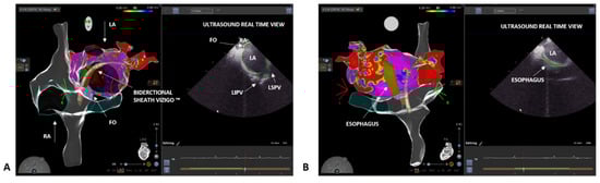 A 46-year-old male was referred to our clinic due to a long history of persistent atrial fibrillation. He had arterial hypertension and diabetes mellitus under good pharmacological control. He also had microcythemia due to a thalassemic trait. The atrial fibrillation was discovered seven years earlier with an electrocardiogram performed during a routine medical examination. The patient was asymptomatic for palpitations, irregular heartbeat, or other cardiological symptoms. An echocardiogram was performed without showing any pathological feature and oral anticoagulation with Dabigatran (CHA2DS2-VASC score 2) was started. After four weeks of therapy, electrical cardioversion was performed with effectiveness in restoring sinus rhythm. An antiarrhythmic therapy with Flecainide 100 mg twice daily was also initiated. The patient did not undergo further medical checks during the following five years, when, during a cardiological visit, the recurrence of the arrhythmia was discovered. The patient mentioned reduction in daily normal activity due to asthenia. An echocardiography exam showed a left atrial indexed volume of 36 mL/m2 and a left ventricular ejection fraction of 47%. AF ablation through PVI was proposed. At admission, the electrocardiogram showed AF. To perform an accurate anatomical reconstruction of the right and left atrium and a high-density voltage map, the multi-electrode mapping (MEM) catheter Pentaray™ (Biosense Webster, Johnson & Johnson Medical S.p.a., Irvine, CA, USA) was used. As in the previous case, we started by mapping the right atrium to define the inferior and superior vena cava, the His location, and the coronary sinus (Figure 2A). Next, a decapolar catheter was inserted in the coronary sinus under 3D EAM guidance. Again, we mapped the FO looking for fragmented and low-voltage signals. However, this time, using the Pentaray™ catheter, we were able to achieve a higher signal resolution and to easily discriminate between a low-voltage and fragmented signal area, although the patient was in AF. Moreover, using the Pentaray™ catheter, we were able to acquire a detailed map in a shorter time (5 min with Pentaray™ catheter vs. 10 min with Thermocool SmartTouch™ SF catheter in the previous case). Again, based on the 3D EAM and under ICE guidance, a single transseptal puncture was performed with the VIZIGO™ sheath and the transseptal needle, both visible on the 3D EAM system (Figure 2B,C). The transseptal puncture procedure followed the same steps already described in the previous case (video of the puncture is available in the Supplementary Materials). The Pentaray™ catheter was then advanced in the left atrium through the VIZIGO™ sheath and a detailed fast anatomical mapping of the chamber and the veins was obtained (Figure 3). The VIZIGO™ steerable sheath was extremely useful to map all the left atrium structures and veins very quickly. Moreover, using ICE imaging and the CartoSound® module, we could identify important structures, such as the pulmonary veins (Figure 3A) and the esophagus (Figure 3B), and to co-register the ultrasound images with the fast anatomical map obtained with CARTO 3®. The Pentaray™ catheter was then replaced by the ThermoCool SmartTouch™ SF catheter to perform PVI following the CLOSE protocol [14]. Again, with the help of the VIZIGO™ steerable sheath, we performed ablations with good contact and stability, leading to a fast and effective PVI. As in the previous case, the entire procedure was performed without fluoroscopy and without complications (procedural time was 110 min, radiofrequency time was 19 min, and fluoroscopy time was 00:00 min:s). The patient was followed up 3 months after the procedure with an outpatient visit, echocardiogram, and electrocardiographic-Holter monitoring, which did not register any AF episode. The echocardiogram showed a normal left ventricular ejection fraction (65%) and the patient mentioned that there was not a reduction in normal daily activities. After 6 months follow-up, the patient is taking low dose of flecainide (50 mg twice per day), apixaban 5 mg twice per day and has not recurrences of AF.