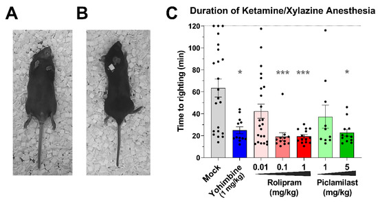 The duration of Ketamine/Xylazine-induced anesthesia was measured as described previously [52] with minor modifications. In short, mice were anesthetized with a combination of Ketamine (80 mg/kg) and Xylazine (10 mg/kg) administered by intraperitoneal (i.p.) injection. Upon loss of righting (2–3 min), the mice were then placed in dorsal recumbency and the time to first righting was measured (see Figure 1A,B). Experiments were ended at 120 min after Ketamine/Xylazine injection, and sleep duration for animals that did not right themselves by that time was recorded as 120 min. To probe the effect of drug treatment, the α2-adrenoceptor antagonist Yohimbine, the PAN-PDE4 inhibitors Rolipram or Piclamilast/RP73401 or Mock/solvent control were injected (i.p.) into anesthetized mice at 10 min after Ketamine/Xylazine administration.