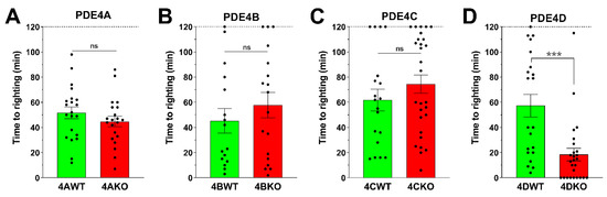 Genetic ablation of PDE4D, but not ablation of PDE4A, PDE4B or PDE4C, shortens the duration of Ketamine/Xylazine-induced anesthesia in mice. Mice deficient in PDE4A (A), PDE4B (B), PDE4C (C), or PDE4D (D), and their respective wildtype littermates, were anesthetized with a combination of Ketamine (80 mg/kg) and Xylazine (10 mg/kg) administered by intraperitoneal injection. Upon loss of righting (~3 min), the mice were placed in dorsal recumbency and the time to first righting was measured. Mice that never lost the righting reflex were counted as 0 min. Data represent the mean ± SEM. Statistical significance was determined using the Mann–Whitney test with 95% confidence interval and is indicated as *** (p < 0.001) or ns (not significant; p > 0.05).