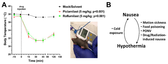Treatment with PAN-PDE4 inhibitors induces hypothermia. (A) The core body temperature of mice was measured at the indicated time points prior to and after injection of the PAN-PDE4 inhibitors Piclamilast/RP73401 and Roflumilast (both 5 mg/kg; i.p.) or solvent control. Data represent the mean ± SEM. Statistical significance was determined using two-way ANOVA with Sidak’s post hoc test. The picture inset illustrates the measurement of core body temperature using a rectal thermometer. (B) Scheme illustrating the reciprocal relationship between nausea and hypothermia frequently observed in humans and animals. Nausea induced by motion, poison, surgery/anesthesia (post-operative nausea and vomiting (PONV)), drug- or radiation treatment is frequently accompanied by hypothermia. Conversely, aberrant body temperature regulation (including cold exposure) can predispose to nausea [44,45,47,48].