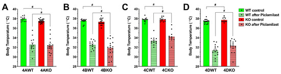 PDE4 inhibitor-induced hypothermia results from the concurrent inactivation of multiple (at least two) PDE4 subtypes. The core body temperature of PDE4 knockout (KO, red bars) mice and their respective wildtype (WT, green bars) littermates was measured just prior to (control, solid colors) and again 30 min after i.p. injection of the PAN-PDE4 inhibitor Piclamilast/RP73401 (after Piclamilast; striated bars; 5 mg/kg). Injection of Piclamilast produced a statistically significant drop in body temperature in all genotypes (p < 0.01 for 4CKO; p < 0.001 for all others). Conversely, the body temperature of mice deficient in (A) PDE4A (4AKO), (B) PDE4B (4BKO), (C) PDE4C (4CKO) or (D) PDE4D (4DKO) was not different from that of their respective wildtype (WT) littermates either prior to or after injection of the PDE4 inhibitor Piclamilast. Data represent the mean ± SEM. Statistical significance was determined using the Mann–Whitney test with 95% confidence interval and is indicated as # (p > 0.05).