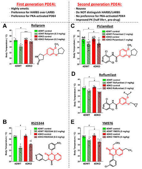 Prior studies have shown that treatment with PAN-PDE4 inhibitors induces a fast-onset, substantial, and long-lasting hypothermia in various animal species, including mice, rats, and rabbits [42,74,75]. As shown previously [42], this is a class effect of PDE4 inhibitors as it is induced by various, structurally distinct PAN-PDE4 inhibitors (see Figure 3A). Intriguingly, an increasing body of evidence causally links nausea and emesis with hypothermia [44,45,47]. Hence, we explored the measurement of core body temperatures to re-evaluate the association of individual PDE4 subtypes with emetic potential.
