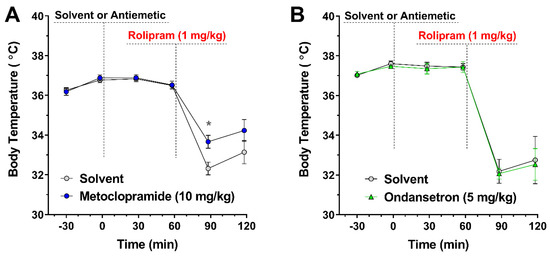 Effect of the antiemetics Metoclopramide and Ondansetron on PDE4 inhibitor-induced hypothermia. After measurement of baseline body temperature (at −30 and −1 min), mice were treated with the antiemetics Metoclopramide (10 mg/kg; o.g.; n = 12) or Ondansetron (5 mg/kg; i.p.; n = 6) or their respective solvent controls (Solvent), followed 60 min later by injection of the PDE4 inhibitor Rolipram (1 mg/kg; i.p.). Body temperature was measured at the indicated time points using a rectal probe thermometer. Pre-treatment with the prokinetic Metoclopramide (A), but not pre-treatment with Ondansetron (B), alleviated PDE4 inhibitor-induced hypothermia. All data represent the mean ± SEM. Statistical significance was determined using two-way ANOVA with Sidak’s post hoc test and is indicated as * (p < 0.05).