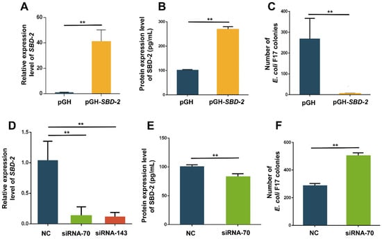 To probe into whether SBD-2 expression has the function of resisting E. coli F17 infection in OIECs, we performed SBD-2 overexpression and RNA interference (Figure 2). The results of relative quantification (Figure 2A) and ELISA (Figure 2B) showed mRNA and protein expression levels of SBD-2 in OIECs treated with pGH-SBD-2 were extremely significantly higher than those of pGH treated cells (p < 0.01). The result of bacteria enumeration (Figure 2C) showed the remarkably decreased adhesion of E. coli F17 to OIECs treated with pGH-SBD-2 compared with that of pGH treated cells (p < 0.01). Besides, we used RNA interference to knockdown SBD-2 expression. As shown in Figure 2D, the interference efficiency of SBD-2 reached more than 50%, and we chose siRNA-70 for next functional verification experiment. The result from ELISA (Figure 2E) showed that SBD-2 protein expression level was significantly reduced in OIECs treated with siRNA-SBD-2 compared with that of non-treated cells (p < 0.05). The result from bacteria enumeration (Figure 2F) showed SBD-2 knockdown could dramatically improve the adhesion of E. coli F17 to OIECs. All these results indicated that overexpression of SBD-2 contributed to enhancing E. coli F17 resistance in OIECs, while SBD-2 knockdown improved adhesion of E. coli F17 to OIECs.