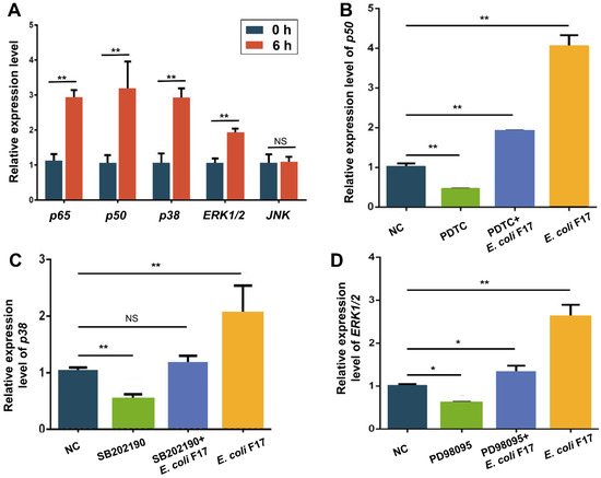 The effect of E. coli F17 stimulation in OIECs on NF-κB and MAPK pathways. (A) p65, p50, p38, ERK1/2 and JNK expression level determined by RT-PCR in OIECs treated with E. coli F17 (107 CFU/mL) for 6 h compared with non-treated control. (B) p50 expression level determined by RT-PCR in OIECs treated with NF-κB inhibitor PDTC, PDTC+E. coli F17 and E. coli F17 compared with non-treated control. (C) p38 expression level determined by RT-PCR in OIECs treated with p38 MAPK inhibitor SB202190, SB202190+E. coli F17 and E. coli F17 compared with non-treated control. (D) ERK1/2 expression level determined by RT-PCR in OIECs treated with ERK1/2 MAPK inhibitor PD98095, PD98095+E. coli F17 and E. coli F17 compared with non-treated control. * p < 0.05, significant difference; ** p < 0.01, extremely significant difference; NS = no difference. Data were shown as mean ± SD, n = 3 biological replicates.