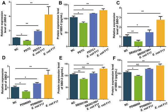 The effect of NF-κB and MAPK pathways on SBD-2 expression. (A) SBD-2 relative expression determined by RT-PCR in OIECs treated with PDTC, PDTC+E. coli F17 and E. coli F17 compared with non-treated control. (B) SBD-2 protein expression determined by ELISA in OIECs treated with NF-κB inhibitor PDTC, PDTC+E. coli F17 and E. coli F17 compared with non-treated control. (C) SBD-2 relative expression determined by RT-PCR in OIECs treated with p38 MAPK inhibitor SB202190, SB202190+E. coli F17 and E. coli F17 compared with non-treated control. (D) SBD-2 relative expression determined by RT-PCR in OIECs treated with ERK1/2 MAPK inhibitor PD98095, PD98095+E. coli F17 and E. coli F17 compared with non-treated control. (E) SBD-2 protein expression determined by ELISA in OIECs treated with p38 MAPK inhibitor SB202190, SB202190+E. coli F17 and E. coli F17 compared with non-treated control. (F) SBD-2 protein expression determined by ELISA in OIECs treated with ERK1/2 MAPK inhibitor PD98095, PD98095+E. coli F17and E. coli F17 compared with non-treated control. * p < 0.05, significant difference; ** p < 0.01, extremely significant difference; NS = no difference. Data were shown as mean ± SD, n = 3 biological replicates.