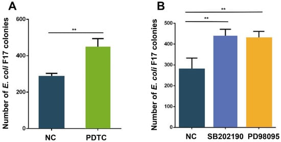 The effect of NF-κB and MAPK pathways on the adhesion of E. coli F17 to OIECs. (A) Adhesion of the F17 fimbria to OIECs treated with NF-κB inhibitor PDTC compared with negative control analyzed by bacteria enumeration. (B) Adhesion of the F17 fimbria to OIECs treated with p38 MAPK inhibitor SB202190 and ERK1/2 MAPK inhibitor PD98095 compared with negative control analyzed by bacteria enumeration. ** p < 0.01, extremely significant difference; data were shown as mean ± SD, n = 3 biological replicates.