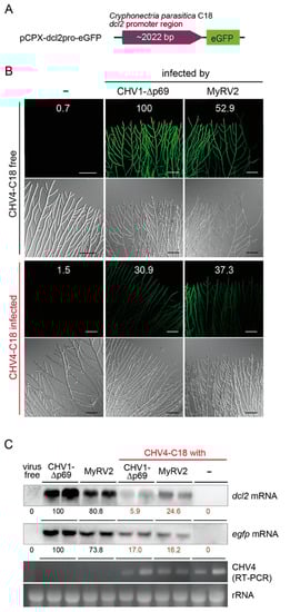 Total RNA extraction and Northern blotting were performed as described previously [34]. Digoxigenin (DIG)-labeled DNA probes prepared by PCR (PCR DIG Labeling Mix, Roche) were used to detect targeted RNAs, i.e., dcl2 mRNA, MyRV2-S10 segment, and CHV4-C18. The accumulation levels of targeted RNAs were quantified by ImageJ software (Version 1.52v, National Institutes of Health, Bethesda, MD, USA) and normalized to those of ribosomal RNA (28S rRNA). To confirm the virus infection, conventional RT-PCR and one-step colony RT-PCR were carried out as described earlier using QuickTaq (Toyobo, Osaka, Japan) or PrimeScript® OneStep RT-PCR Ver.2 (Takara Bio), respectively [28,36]. Table S1 lists all primers used in this study. RT-qPCR was performed as described by Hyodo et al. [37] to quantify dcl2 mRNA and MyRV2 S4 mRNA. Primer pairs, double-stranded RNAs were isolated by the method of Eusebio-Cope and Suzuki [34].