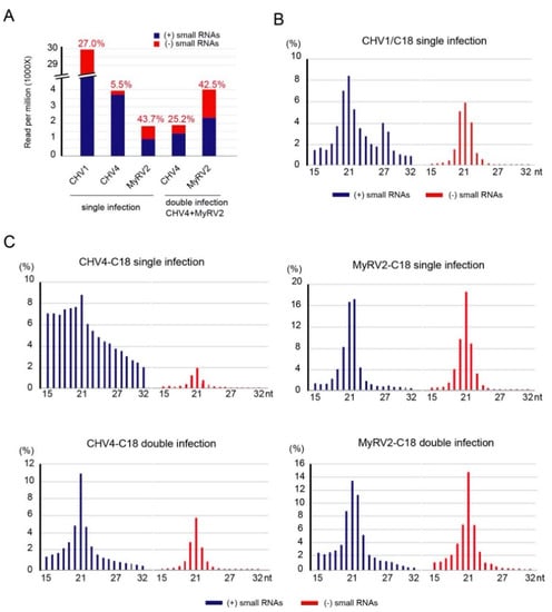 Previous results have shown that the disruption of dcl2 in C. parasitica affects the small RNA profile of CHV1-∆p69 [40]. To investigate the small RNA profiles of CHV4-C18 and MyRV2 in single and double infections, small RNAs were deep-sequenced. The C. parasitica strain C18 infected with CHV1-EP713, a hypovirus with a well-characterized RNA silencing suppressor, was used as a reference. CHV1 derived small RNAs showed lesser accumulation in their negative-strands (27%) than the positive-strands (73%), both having a peak of 21 nt as reported by Zhang et al. [12] (Figure 2A,B).