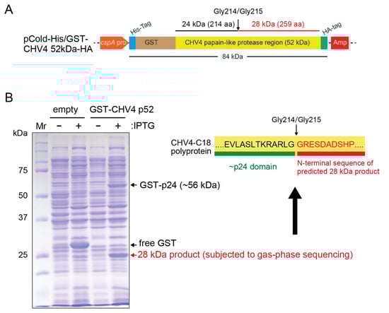 To test the hypothesis that CHV4-C18 p24 is a papain-like cysteine protease, an E. coli expression construct was prepared, as shown in Figure 3A. The N-terminal fragment of the CHV4-C18 polyprotein (52 kDa polypeptides), including the tentative protease p24 coding domain, which carried a His-tag and GST at the N-terminus and an HA-tag at the C-terminus, was expressed in E. coli cells. The expected total molecular mass of the recombinant protein (His/GST-CHV4 52kDa-HA) is ~84 kDa.