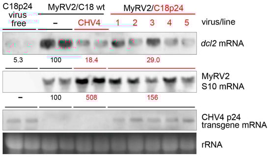 MyRV2 accumulation in CHV4-C18 p24 transformants, represented by the S10 segment, compared with that in non-transformant C18 in the absence or presence of CHV4-C18. Interestingly, transgenic expression of CHV4-C18 p24 enhanced MyRV2 accumulation, though not as greatly as CHV4-C18 co-infection, (Figure 4, second row). MyRV2 accumulation was slightly higher, albeit not at statistically significant levels (Figure S4), in the p24 transformants (approximately 1.6-fold relative to wild-type C18) than in non-transformants not infected by CHV4-C18, but much lower than in lines co-infected by CHV4-C18 (approximately 5-fold relative to wild-type C18) (Figure 4, second row). Enhanced MyRV2 accumulation was not observed in transformants with the empty vector pCPXHY3, which showed slightly lower MyRV2 accumulation than C18p24 (Figure S3).