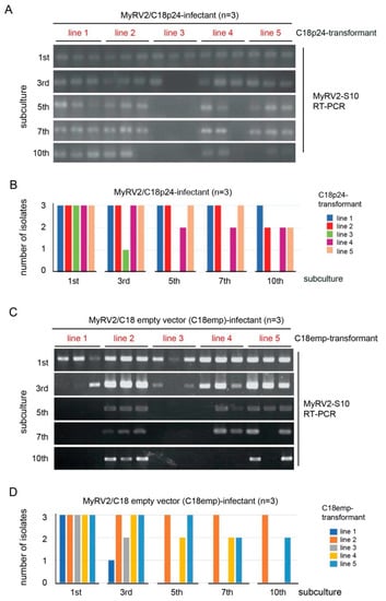 Enhanced infection stability of MyRV2 by transgenic expression of CHV4-C18 p24. (A,C) Detection of MyRV2 infection by RT-PCR in C18 transformants with the CHV4 p24 coding domain (C18p24) or the empty vector (C18emp). Virus infection in three transfectant subisolates from 5 independent transformants (lines 1 to 5) was monitored until 10th subcultures by colony RT-PCR. RT-PCR was carried out as described by Aulia et al. [28] using the primers CHV4-287_F and CHV4-853_R. Amplified fragments were analyzed in 1.2% agarose gel electrophoresis. (B,D) MyRV2 Infectivity after successive fungal subculture in C18p24 transformants (B) and transformants with the empty vector (C18emp) (D).