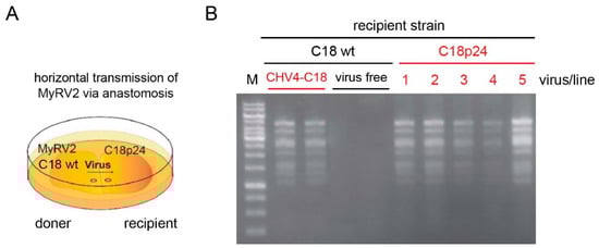 Transgenic expression of CHV4-C18 p24 in recipient C. parasitica strains facilitates horizontal transmission of MyRV2 via anastomosis. Non-transgenic donor isolates containing MyRV2 (left side of panel A) were co-cultured on PDA with CHV4-C18 p24 transformants (C18p24) as recipients (right side of panel A), or with virus-free (C18-VF) and CHV4-C18-infected (C18/CHV4) recipients as controls. Following anastomosis, subcultures were obtained from the recipient side and tested for MyRV2 infection by conventional dsRNA extraction and agarose gel electrophoresis (panel B).