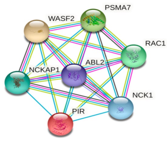 A bioinformatic analysis demonstrated that Pirin is functionally associated with Wiskott–Aldrich syndrome protein family member 2 (WASF2), Proteasome subunit alpha type-7 (PSMA7), Ras-related C3 botulinum toxin substrate 1 (RAC1), Nck-associated protein 1 (NCKAP1), Cytoplasmic protein (NCK1) and Abelson tyrosine-protein kinase 2 (ABL2) (Figure 2). WASF2 is involved in signal transmission from tyrosine kinase receptors to actin filaments leading to lamellipodia formation [28,29]. PSMA7 participates in the ATP-dependent degradation of ubiquitinated proteins [30]. RAC1 is a GTPase which is involved in a plethora of cellular processes such as cell growth, cytoskeletal reorganization, and protein kinase activation, among others [31,32]. NCKAP1 is part of the WAVE complex that regulates lamellipodia formation through the reorganization of actin filaments, is involved in cell invasion, and promotes cancer cell malignancy [33,34]. NCK1 is an adapter protein which interacts with tyrosine-phosphorylated growth factor receptors, playing a role in DNA damage response by activating downstream effectors. In addition, NCK1 is involved in actin cytoskeletal remodeling, podosome formation and cancer invasion [35,36]. ABL2 is a cytoplasmic tyrosine kinase which coordinates actin remodeling through tyrosine phosphorylation of proteins controlling cytoskeleton dynamics. Taken together, the functional association of Pirin with proteins involved in cytoskeleton reorganization partially explains the link between Pirin overexpression and increased cell migration in some cellular models [37,38]. Further experimental settings are warranted to elucidate the molecular mechanisms involved in these functional associations.