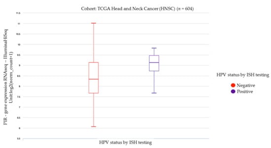 PIR transcripts expression in head and neck cancers (TCGA, n = 604) stratified by ISH testing for human papillomavirus (p = 0.02028, Welch’s t-test). Raw data were extracted from University of California, Santa Cruz (ena.ucsc.edu). UCSC Xena functional genomics explorer (https://xenabrowser.net) [96].
