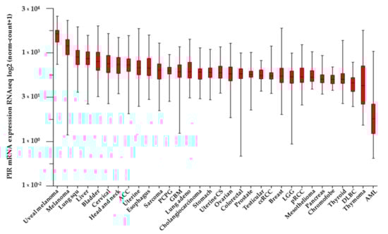 PIR transcript expression in human cancer (TCGA, n = 10071). p < 0.0001, Welch’s ANOVA test. Raw data were extracted from University of California, Santa Cruz (ena.ucsc.edu). UCSC Xena functional genomics explorer (https://xenabrowser.net) [96].