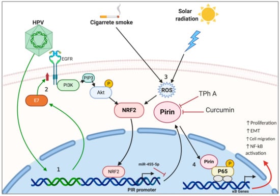 Pirin is an established OS sensor and part of the functionally diverse cupin superfamily. Similar to other cupin proteins, Pirin shows enzymatic properties and acts as a nuclear transcriptional regulator. However, its potential oncogenic activity has been a growing topic of discussion in the past years. Recent findings have shown that Pirin plays a role in the development of cancer in epithelial lung, skin, cervical, and oral tumors. Diverse factors (such as environmental and viral) promote ROS increase, consequently raising Pirin levels for activating NF-κB, cell proliferation, cell migration and EMT. In addition, HPV E7 oncoprotein promotes EGFR/PI3K/AKT/NRF2 pathway activation, leading to NRF2 recruitment in the PIR promoter, in turn increasing Pirin expression (Table 2 and Figure 5). This suggests a key participation of Pirin in cancer promotion and progression, although additional experimental approaches, including animal models, for testing Pirin-mediated tumorigenesis are warranted. Thus, this accumulating evidence provides auspicious signs of Pirin as a significant potential biomarker or therapeutic target in the years to come.