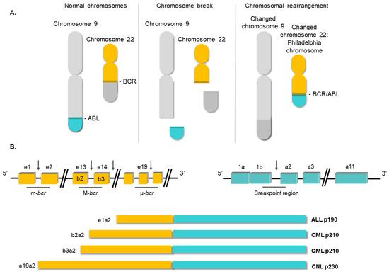 Structure of the BCR/ABL1 oncogene. (A) Schematic representation of the t(9;22) (q34;q11) translocation triggering the Philadelphia chromosome. (B) Breakpoint locations between BCR and ABL1 genes. Different fusion protein combinations yield different outcomes.